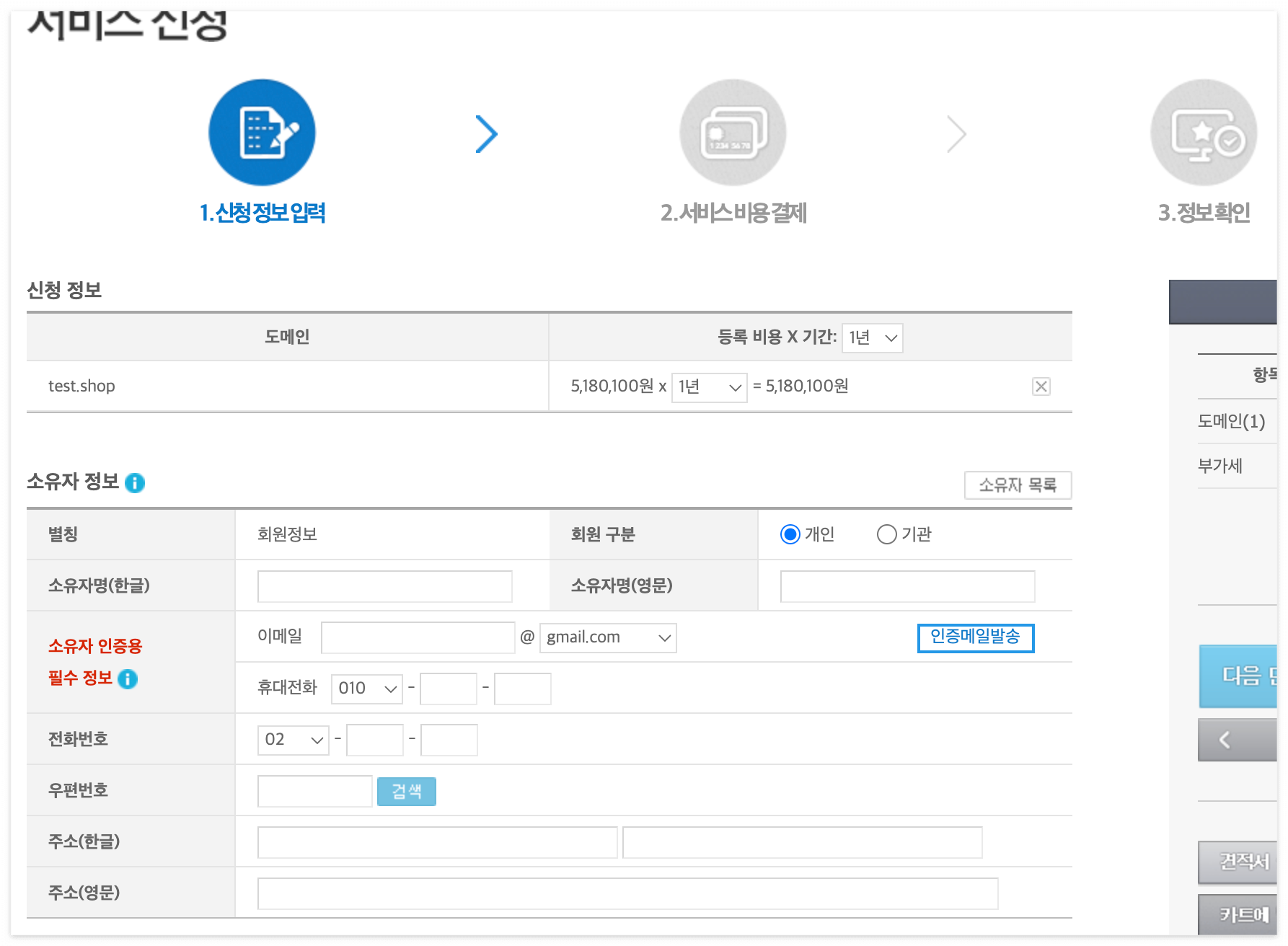 해당 페이지에서 도메인을 소유할 소유자 정보와 서비스 관리정보 등 정보를 넣은 후에 서비스 비용을 결제하면 도메인 구매가 완료됩니다.