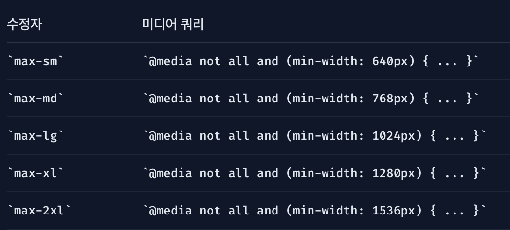 이는 접두사가 없는 유틸리티 클래스는 모든 화면에서 적용되고 접두사가 있는 유틸리티 클래스는 지정한 중단점 이상의 화면에서만 적용되는 구조이다.