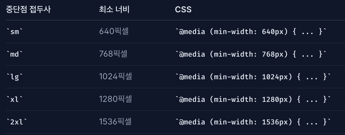 Tailwind CSS는 모바일 우선(Mobile-First) 중단점 시스템을 사용한다.