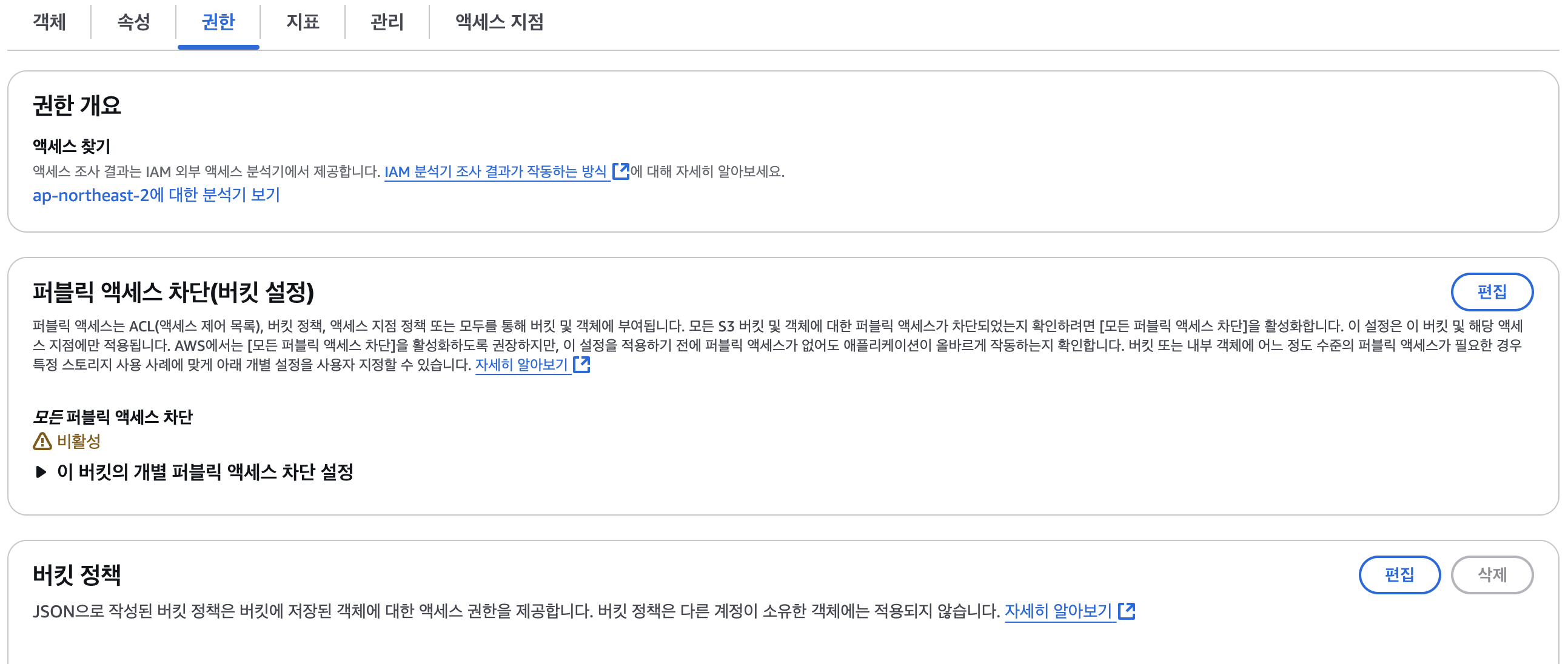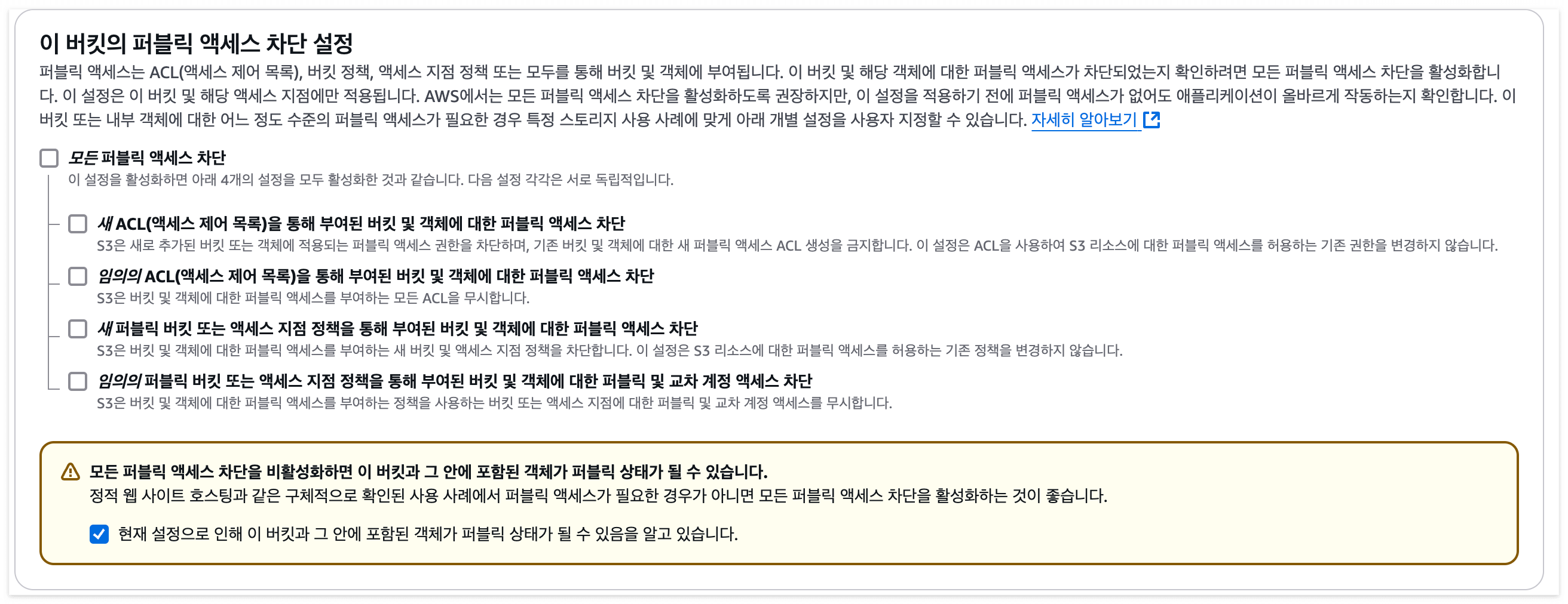버킷 퍼블릭 액세스 차단 설정을 해제하고 경고문에 대해 "현재 설정으로 인해 이 버킷과 그 안에 포함된 객체가 퍼블릭 상태가 될 수 있음을 알고 있습니다." 체크