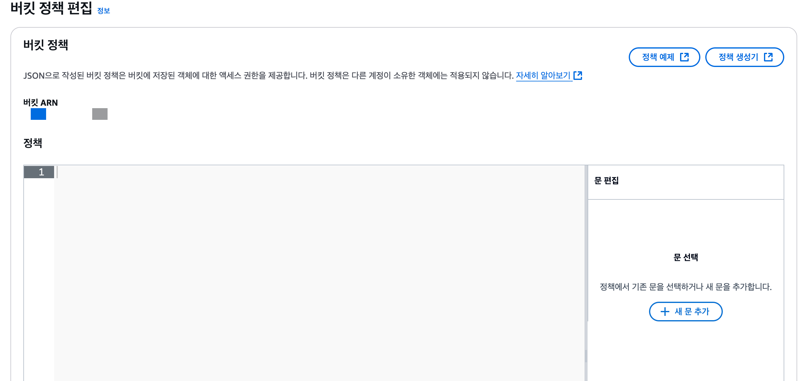 버킷의 권한 탭으로 넘어가 "버킷 정책"에 편집을 누른다.
