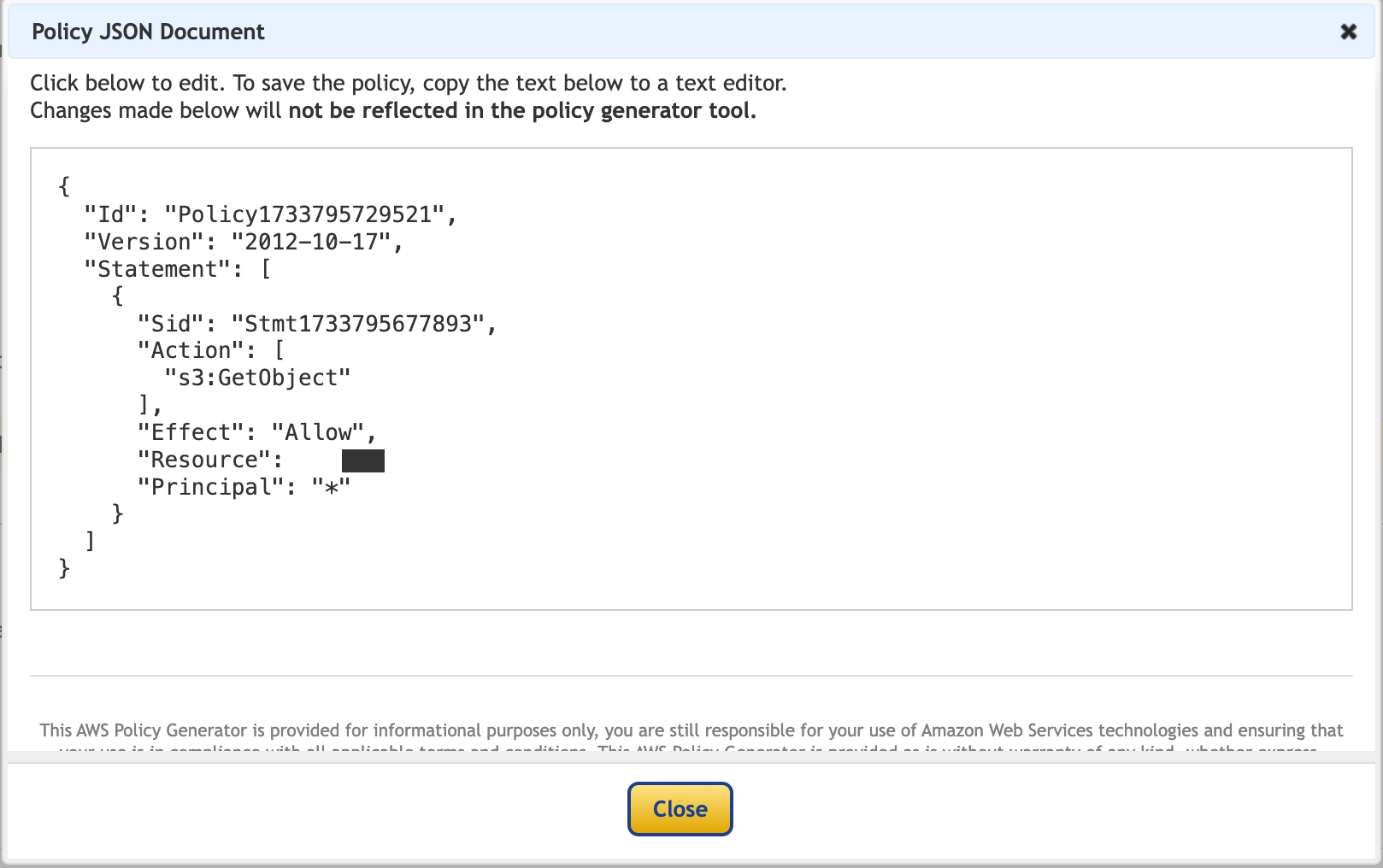 버킷 정책 편집에 버킷 ARN을 미리 복사하고 "정책 생성기"를 클릭한다.