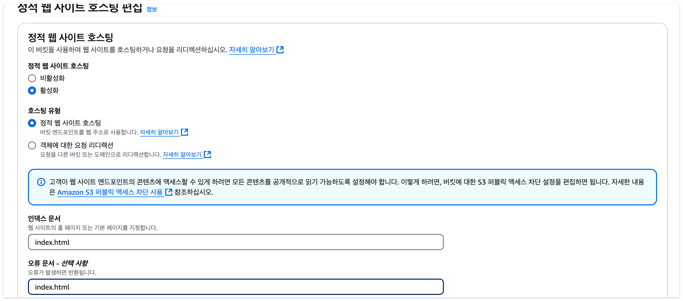 정적 웹 사이트 호스팅을 활성화로 변경하고 인덱스 문서와 오류 문서에 "index.html"을 작성한다.