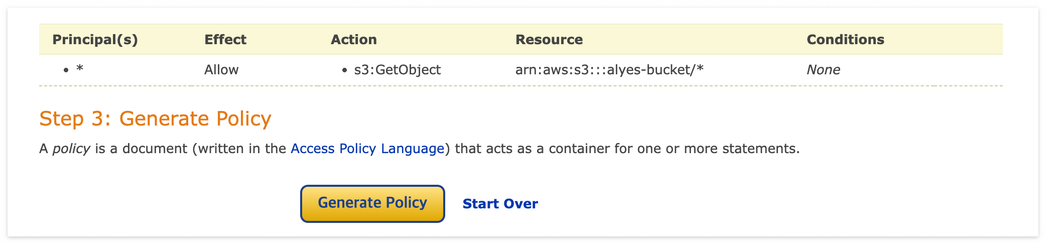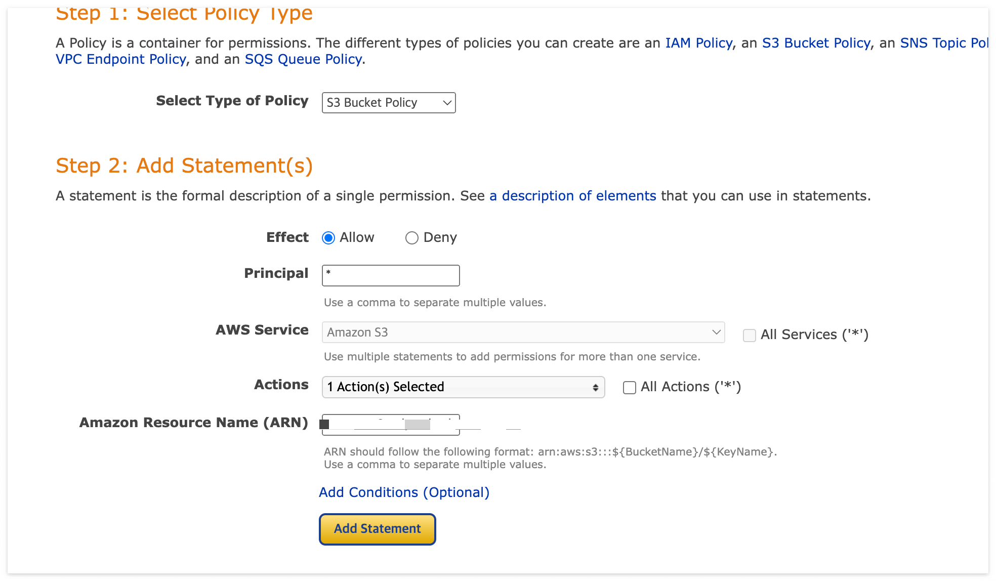 - Select Type of Policy : S3 Bucket Policy 선택,
