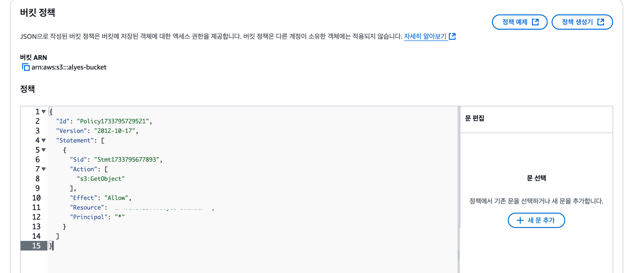 생성된 JSON을 전부 복사하고 버킷 정책에 붙혀넣기를 한다. 그리고 버킷 정책 저장을 완료한다.