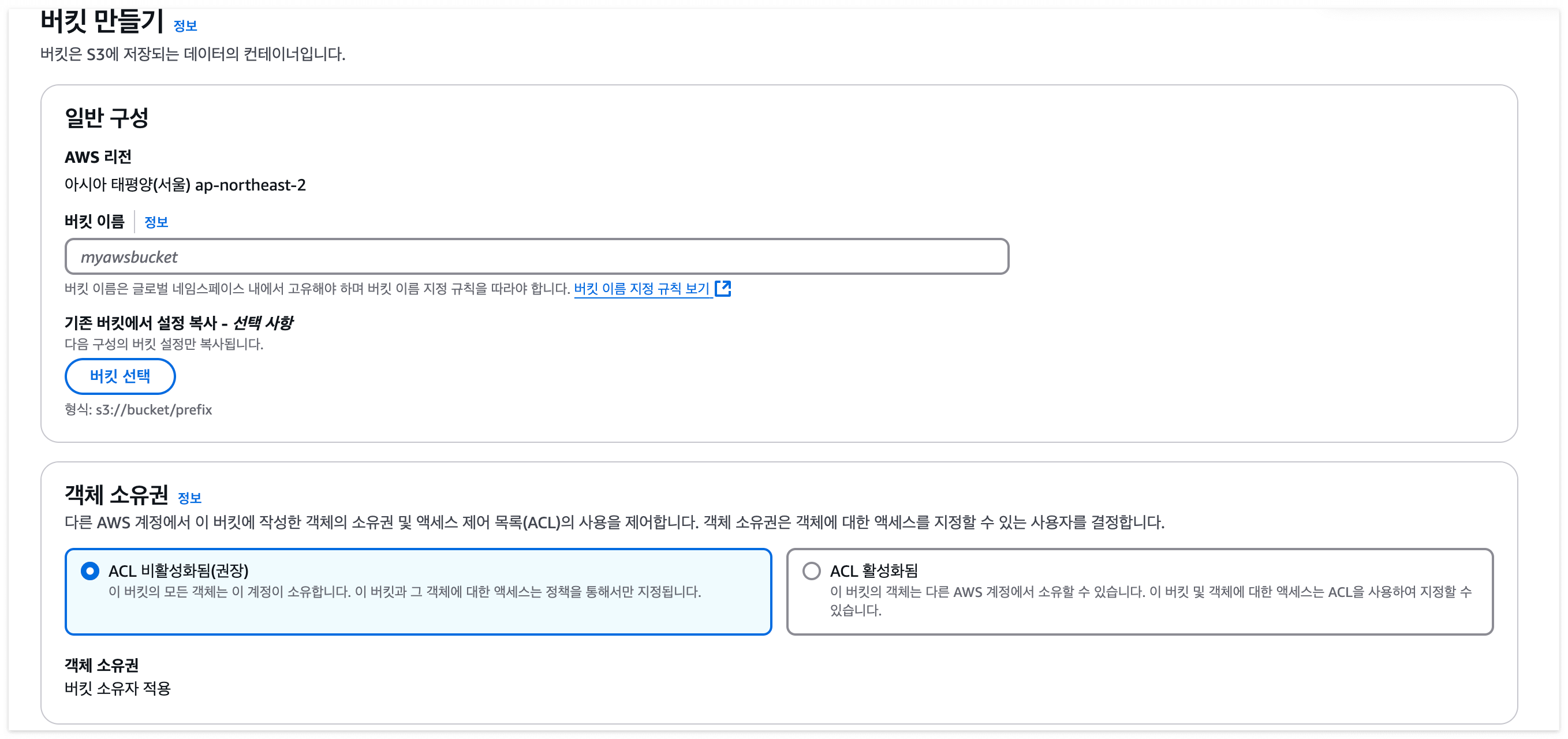 버킷 이름을 작성하고 객체소유권에 대한 설정을 해주면 된다.